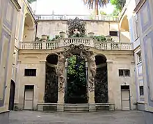 The open courtyard is bordered on the sides by the rear wings of the palazzo, while the terraces overlook a grandiose nymphaeum built in the 18th century to a design by Domenico Parodi. The nymphaeum, which harmoniously blends architectural, natural and sculptural elements, is heir to a particularly flourishing tradition in Genoa, which already had illustrious examples in the villa Pallavicino delle peschiere, in the villa of the Prince, and in the nearby palazzi di Pantaleo Spinola and Balbi Senarega. Here the architect-sculptor Parodi devised a monumental and unprecedented solution, exploiting the copious waters of Castelletto to connect the courtyard with the garden two levels higher up, entrusting the stucco sculptures of the gigantic tritons and the putto throwing water to his pupil Biggi, while the group of Phaeton falling from the sky placed in the centre of the grotto and crumbled over the centuries by the water is lost.[3] A garden opens towards the mountain, erected by exploiting the slope of the hill behind.