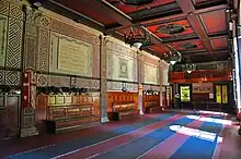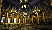Famous is the Sala d'oro designed by Gerolamo Arganini and decorated by Giacomo Tazzini: the hall, remodelled on the occasion of the wedding of Emperor Ferdinand I, is spacious and monumental, surrounded by a colonnade decorated with fregi and surmounted by the entablature forming the tribune for the orchestra;[1] the frescos and gilded stuccoes on an ivory background also stand out; similarly the Sala d'silver named after the silver-coloured stuccoes by Luigi Tatti.