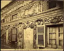 Bergamasco's «mark», of full Mannerist observance, can be read in the very fine and original design of the portal richly elaborated with female herms set in a decoration of various architectural motifs, supporting a broken tympanum with spiral volutes, executed in white marble by sculptors Giacomo Ponzello and Pompeo Bianchi (1560). However, what is most striking about Bergamasco's decorative work is the relief decoration of the façade, with its fanciful fresco and stucco quadrature, similar to that executed in the same years by Bergamasco in the palazzo Gio. Vincenzo Imperiale in Campetto — built between 1555 and 1560 — and in palazzo Nicolosio Lomellini in Strada Nuova (1558).[3]