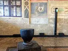 In the northeast corner of the hall is situated a particular tool: the "Pietra del Vituperio". It is a stool of black stone which was located at the middle of the hall in the Middle Ages and was used to publicly humiliate insolvent debtors, who were obliged to sit there as in the stocks.[3]