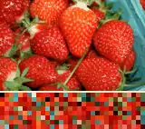 Then, when loading the mosaic of image thumbnails (or other heterogeneous images), the program simply maps every original indexed color pixel to its most approximated in the master palette (after dumping this into the hardware color registers), and writes the result in the video buffer. Here is a sample of a simple mosaic of the four image thumbnails using a master palette of 240 RGB arranged colors plus 16 additional intermediate shades of gray; all images are put together without a significant loss of color accuracy: