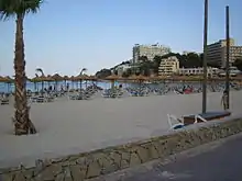 Palma Nova Beach is seven kilometers (4.3 mi) from Calvià, situated between Punta Nadala and es Carregador, on the Spanish Balearic island of Majorca. Besides Palmanova beach, other names by which the beach is known include "Playa de Palma Nova",[map 1] and "Platja de Palma Nova". The Palma Nova sea front has three beaches: Torrenova, Es Carregador, and Palma Nova.[1] The beach has had an extension of 500 meters (1,600 ft) and has needed an artificial regeneration to achieve the current aspect of fine and white sand, as well as its dimensions.