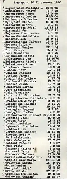 The best-documented massacre took place on 20–21 June 1940 when three transports with 358 inmates were sent from Pawiak to the place of execution near Palmiry. Among the victims were:[37][38]