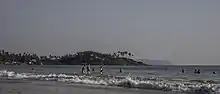 Palolem Beach is largely unspoiled and is inhabited by both local fishermen and by foreign tourists who live in shacks along the shore or in the main village itself.[1] It is about one mile (approximately 1.61 km) long and is crescent-shaped; one can view the entire beach from either end. Both ends of the beach consist of rocks jutting out into the sea. The depth of the sea increases gradually, being shallowest at the northern end of the beach, making it safe for average swimmers, and the currents are not fast.