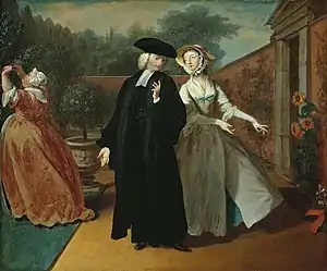 The book was already a popular one for painters - the younger artist Francis Hayman had produced designs for Gravelot's engravings for the 1742 edition[1] as well as a pair of scenes from the novel for Vauxhall Gardens, also around 1742[2] (one is lost and the other is now in the National Trust's collections at Sizergh Castle[3]). Highmore painted his series of twelve works between 1741 and 1743 and on 16 February 1744 advertised that ten of them were ready to be viewed at his studio, with another advertisement on 10 May announcing that all twelve paintings in the set were complete. The first advertisement also stated he was taking subscriptions for a set of twelve engravings after the novel[4] — Highmore had Louis Truchy and Antoine Benoist produce them.[5][6]