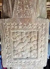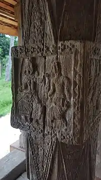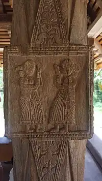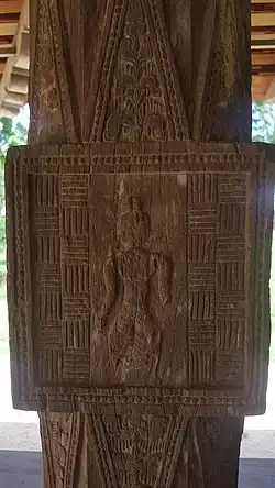 The body of the posts are carved in an octagonal shape with a square panel at the middle of each post. Each of the square panels of all the 9 inner posts are decorated with elaborate carvings. There are 36 such panel carvings. Additionally, the pillar heads (connecting the posts to the roof), beams, rafters and reepers are also richly carved.[9]