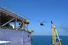 An Indian Air Force Mil Mi-17 helicopter approaching an oil rig in the Panna oilfield, approximately 100 km southwest of Mumbai.