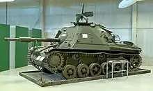 The Pvkv m/43 was built on the chassis of the Stridsvagn m/42. It had a casemate design in place of a turret. The superstructure had an open top to reduce weight and a tarpaulin was used as protection against rain.[1][3][4] The superstructure is located at the front of the vehicle and was slight sloped. The vehicle was operated by a crew of 4.[1][2][5]