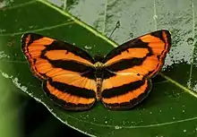 Both male and female have upperside black with orange markings. Forewing: discoidal streak broad, anteriorly twice indented, at apex extending into base of interspace 3; posterior discal spots coalescent, forming an irregular oblique short broad band; anterior spots also coalescent, oblique from costa; a postdiscal obscure grey incurved transverse line, and a very slender, also obscure, orange transverse subterminal line. Hindwing: a subbasal transverse broad band, and a much narrower postdiscal band curved inwards at the ends; beyond this the black terminal margin is traversed by a darker black subterminal line. Underside chestnut-brown, covered with short, slender, transverse brown striae on the margin of the orange markings, which are similar to those on the upperside but broader, paler, and less clearly defined. Forewing: the pale transverse postdiscal and orange subterminal lines of the upperside replaced by a postdiscal lilacine narrow band, defined by somewhat crenulate chestnut-brown lines on each side, and a pale subterminal line. Hindwing: the base suffused with lilacine; the subbasal and postdiscal bands bordered outwardly by narrow lilacine bands, the orange-yellow of the postdiscal band much obscured by the transverse brown strife; the terminal margin with a sinuous obscure broad lilacine line. Antennae, head, thorax and abdomen are black; beneath, the palpi and thorax greyish, abdomen ochraceous.[3]
