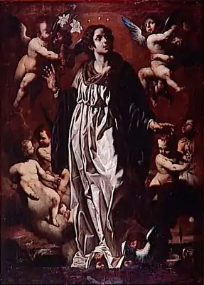He painted extensively in 1620–1626 in the Certosa di San Martino in Naples. He painted a Baptism of St Celsus (c.1635) for the Pozzuoli Cathedral. He also painted a number of Immaculate Conceptions, including versions in San Lorenzo Maggiore of Naples; in the Annunziata of Airola; in the church of San Francesco in Montesarchio; and in the Palais des Beaux-Arts in Lille,[1] as well as a Virgin with saints Margaret, Bernard & Anthony of Padua (1634) for the church of Santi Bernardo e Margherita a Fonseca in Naples, and an Annunciation and Bride of the seven canticles for the church of the Annunziata at Airola.