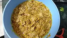 Papad ki Bhaaji or Papad ka Saag is a vegetarian main course dish made using Papad and is popular in Rajasthani, Gujarati, Bundeli, Malwi, Nimadi and Braj cuisines.[1] The dish is prepared with many variations and is also known by the name Papad ro saag in Rajasthani and Papad nu shaak in Gujarati. Papad ki bhaaji can be easily prepared with few basic ingredients at home and without the need of any vegetable. Hence it typifies the simple food that one needs for sustenance amidst the hardship of desert life.