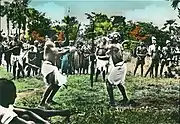 The Papel territory of Bissau was in a constant state of intense warfare, particularly from 1884 to 1915, because of Portuguese and Papel forces.[2]: 53 [5]: 4 On 14 February 1891, when the Portuguese called a meeting to adjust the current peace treaty between them, Antula, Intim and for them to submit to Portuguese authority of which only chiefs of Antula agreed to.[2]: 58 This situation caused war to break out with the other Papel vassal states attacking the Portuguese fortress eight days later, and killing the soldiers guarding the bastions though the Portuguese defended themselves effectively until reinforcements arrived.[2]: 58 The attack plunged the region into a state of hostilities with the Portuguese declaration of war on the next day, banning the sales of guns and gunpowder to the natives, and increasing gunboat patrols of the local waters.[2]: 58 On 24 February 120 Portuguese troops accompanied by five officers marched into Papel territory, the troops were crushed by the Papels and forced to retreat.[2]: 58 On 9 March that year the Portuguese once again were defeated by the Papels, and in the month of May during the Portuguese attempt under Minister Antonio Eanes to extend the wall of one of their fortresses, the Papels opened fire on them handing the Portuguese another defeat, this led to Papel warriors replacing their necklaces usually decorated with beads with the teeth of their fallen enemies.[2]: 59 The relationship between the Papels and Portuguese were so sour that the Papels would watch the fortress continuously, waiting for people to leave, this occurred when a Cape Verdean left the fortress and was set upon by Papels and killed, they were reported to then of gathered at the top of Intim celebrating the killing with war dances and making preparations for war.[2]: 59 This is what they got, the Portuguese on 1 December declared war on the Papels once again for the murder, they bombarded Bissau with artillery pieces and would regularly enter gunfights with the Papels, this attack did not result in a Papel full out attack which confused the Portuguese into a belief of victory.[2]: 59 The Papel lack of response was due to their mobilisation of other ethnicities into the war such as the Balanta, the Papel had planned a sneak attack on 7 December but even though it came as a surprise, the Portuguese were able to escape defeat due to the increased security they prepared around the fortress.[2]: 59