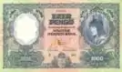 The first denomination of the second series of pengő banknotes was the 1000 pengő note, designed by Zoltán Egri.[1] In contrast to the 1926 series, this banknote (as well as the other notes of this series) was printed using intaglio printing. The next banknote of the series was the 5 pengő note (dated 1928), then the 10 pengő (1929), 20 and 100 pengő (1930), and the 50 pengő notes (1932). These banknotes were designed by Álmos Jaschik.[2]