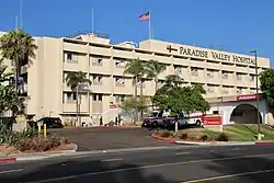 In 1883, Dr. Anna L. Potts started construction of Mount Paradise Sanitarium seven miles from San Diego. The thirty room sanitarium was finished in 1887. But in 1895, lacking water and patients, Dr. Potts closed Potts Sanitarium, mortgaging it for $14,000.[1] In 1900, Ellen G. White a founder of the Seventh-day Adventist Church repeatedly received strong impressions from God that the region was a good location for a sanitarium and hospital. During Mrs. White's visit to San Diego in 1902, Paradise Sanitarium was for sale for $11,000. Real estate prices slowly declined as the drought continued. In 1904, the price was down to $6,ooo, but the local conference didn't want to buy it. Later Mrs. White and a wealthy friend, Mrs. Josephine Gotzain, bought it for $4,000.[1] There still was no water, so Ellen White hired a well digger and water was found at 98 feet. Before Paradise Valley Sanitarium could open, Mrs. Julia Ulrich arrived becoming the first patient. Others followed putting off the dedication of the sanitarium until 1906. After 5 years Paradise Valley Sanitarium was sold to the Seventh-day Adventist Church in 1910.[1] Mabel White, the sanitariums first nurse did all the cooking and cleaning. The sanitarium gave natural remedies, a healthy diet and clean living. A training school for nurses was started at Paradise Valley Sanitarium in 1909. In 1914 the school was approved by California and continued to operate until 1966. In 1966 a new Paradise Valley Hospital opened in National City.[1]