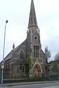 Park Congregational Chapel was erected at a time when Llanelli had become a significant regional producer of tinplate and steel and the population was growing strongly and needed more buildings in which to worship. The architects were Lander and Bedells of London, and the chapel was built between 1864 and 1865 in the very Gothic but inaccurate style liked by the Congregationalists. The tower is square and slender and is capped by an octagonal collar and a plain stone spire. The interior of the chapel is smaller than one might expect, being rather low with a boarded end-gallery. There are large quantities of stained glass; Abbot and Co installed some in 1884 and 1908, others in 1919 and 1934 and a more recent example by Celtic Studios was installed in 1974.[1]
