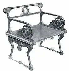 The wrought iron garden furniture is missing. Due to its great weight it was probably kept at outdoor places for the tea parties during the summer season which lasted from 1 May(day of purchase of Glienicke) until 3 November (Hubertus's hunt). Some of the garden furniture was probably designed by Schinkel,[24] other parts were in Louis Quinze style or Empire style.[14]:48 Wrought iron benches were presumably placed at smaller vantage points like e.g. the Lilac Pergola on the Lenné hill(as it is called nowadays) or the Lime Trees Pergola. The Lime Trees Pergola is the only non-architectural pergola in Glienicke which is still visible today. It consists of eight lime trees at a junction near the Cloister Courtyard which are the remains of the late 18th century geometrical aligned avenue trees. Near Lions Fountain and Stibadium the “Sphingentreppe”, a low rise flight of steps, is covered with a trellis designed by Persius. The flight of steps is named after the Sphinx statues placed at the foot of the steps which like the ill-fitting steps are from the demolished neoclassical greenhouse with a garden room at the site of today's Stibadium.