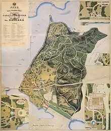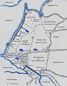 Park Glienicke, (German: Park Klein-Glienicke or Glienicker Park) is an English landscape garden in the southwestern outskirts of Berlin, Germany. It is located in the locality of Wannsee in the Steglitz-Zehlendorf borough. Close to Glienicke Bridge (known as Bridge of Spies) the park is open to the general public. The park is part of the UNESCO World Heritage Site Palaces and Parks of Potsdam and Berlin (Potsdam cultural ensemble).[1] Within the ensemble it is one of the five main parks, the others being Sanssouci Park, New Garden (Neuer Garten), Babelsberg Park and Peacock Island (Pfaueninsel). Regarding diversity in gardening styles within the Potsdam park ensemble Park Glienicke is only superseded by Sanssouci Park. Furthermore, it is a park especially characterized by one personality due to the intense involvement of Prince Charles of Prussia. The park covers approximately 116 hectares (290 acres)[2]