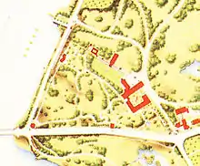 Elliptical and round flower beds with terracotta palmette borders are typical for garden courtyard and pleasure ground. The restoration was supported by discovering original border stones in the cellar of the Curiosity pavilion.[12] In the underground the beds are walled in allowing for specific irrigation, therefore the pleasure ground has been crisscrossed with water pipes. As the clay pipes on Peacock Island lasted only ten years after being installed in 1824 expensive iron pipes supplied by the Prussian industrial pioneer F.A. Egells (de) were installed in Glienicke when in 1838 the pumping station started operating with a steam engine, a gift by Charles’ father which was also manufactured by F.A. Egells.[5]:202 The beds were filled with a loose subsoil which facilitated the quick replacement of plants. There are some figurative designed beds bordered with buxus which add to the pleasure ground an artificial aspect, e.g. the Oak Leaf bed near the Lions Fountain and the Diana(Greek:Artemis) or Pliny bed at the Casino. An Athena statue, which is now at the British Museum, stood in a niche on the northside of the Casino characterizing it as a place of art. Most striking is the Lilies bed beneath Charles' bedroom windows at the western facade of the palace. It is a heraldic sign referring to Charles' younger sister Louise who was married to Prince Frederick of the Netherlands. She was very supportive sending bulbs to Charles. In Glienicke planting of roses has been almost non-existent in contrast to Babelsberg Park and Peacock Island. The pleasure ground in Glienicke is rather a portrayal of an antique villa complex as described by Pliny the Younger than a reflexion on a longing for Italy(Italiensehnsucht).