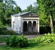 The Stibadium was designed by Friedrich Ludwig Persius and built on the site of a neoclassical greenhouse with a garden room(built after 1796) in 1840.[16]:63 The semi-circular Tholos structure with a wooden half-cone roof was the main place for having tea. On the underside of the roof a twelve deities programme is painted. As there are 14 fields the Twelve Olympians were supplemented with Bacchus and Amphitrite. The middle pillar had originally a zinc-cast Kore designed by August Kiss which later was replaced with a marble copy of the Felicitas Publica in the monument Max-Joseph Denkmal by Christian Daniel Rauch in Munich.[17] On the terrace stands a granite bowl by Christian Gottlieb Cantian which Charles inherited after his father died in 1840. The Stibadium had the function to be a shield between pleasure ground and Drive. It had also the opposite purpose of the Curiosity pavilion. While looking on the common people from such an elevated and prestigious building the Prince's tea party was on show to the people at the same time. The paintings of the Twelve Olympians may seem presumptuous, yet they are an artistic expression of how Prussian aristocrats saw themselves in the age of European Restoration.