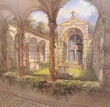 In 1850 the Cloister Courtyard between Casino and the greenhouses was erected as the last building on the pleasure ground. The formal reason for the building was to house Charles' extensive collections of medieval art and Byzantine sculptures. Historic building parts were purchased in Venice to be used as spolia in the Cloister Courtyard where Charles developed the first collection of Byzantine works of art in modern Europe.[20] The building has been described as a political statement by Prince Charles in the aftermath of the revolution of 1848. It is regarded as a tribute to the Byzantine Empire as a God-given unity of throne and altar in the Late Antiquity and Middle Ages. Furthermore, it is seen as a hidden tribute to Russia and its political order as the Russian emperors saw themselves as successors of the Byzantine Emperors.[21]:51- The Cloister Courtyard represents an unusual mixture of a romantic architecture depicting the contemporary atmosphere and of the function as a museum, so to speak a very late Hermitage with scientific pretension and political statement.[11]:290–291 Part of the collection in the Cloister Courtyard was the Imperial Throne of Goslar which Charles acquired with the help of his former tutor Heinrich Menu von Minutoli who had fostered Charles’ interest in antiquities.[22] The throne was kept together with other medieval treasures in a chapel-like vault.[4] :383 In 1871 Charles loaned the throne to his brother Emperor William I to be used as the Emperor's seat in the imperial ceremony opening the first Berlin Reichstag. Charles left the throne in his will to the town of Goslar. The most precious relief on the walls of the Cloister Courtyard was a late 12th century tondo of the Byzantine Emperor. Nowadays only a reproduction is on display. The original is part of the Byzantine Collection of the Dumbarton Oaks Museum in Georgetown, Washington, D.C..