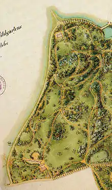 Lenné's park design is characterized by very many and seemingly surprising sightlines in the park itself as well as in the Potsdam cultural ensemble. The continuous interlocking of meadows creating the highest degree of views is also typical for Lenné. Figurative flower beds, lively structured ponds and mountainous designed park parts are typical for landscape gardening by Prince Pückler. In Glienicke Prince Charles united both approaches, yet the western parts of the park show clearly the hand of Lenné. Regarding the park design Charles did not meet Pückler in person for decades, although they were introduced at the Congress of Aix-la-Chapelle in 1818. Yet it is remarkable that Charles used the presence of Pückler's employee Jacob Rehder (de) at Babelsberg to consult him about Pückler's approach to landscape design while Pückler travelled through the north of Africa and the Near East from 1834 to 1840.[25]:149 Around 1837/38 Charles deviated from Lenné's design principles when he designed three ”gorges” in the part of the Shore Ridge Path and started to subdivide Lenné's unified designed park into parts. Pückler started the first of his eight visits to Prince Charles in Glienicke only in 1853, the same year the court gardener Friedrich Schojan, who had already served Hardenberg, retired.[5]:62–79,124–161 Schojan was succeeded by August Gieseler who previously worked at Muskau Park.[26]