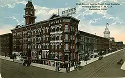 A fire in 1902 caused damages of at least $2,000 to the building at the time, and $1,500 on personal property.[19] In December 1905, the hotel was largely vacated, with the gas turned off, after it was announced the hotel's new manager had abandoned his position.[20] In June 1906, the Northern Hotel Company was incorporated and purchased the hotel, to be reopened on September 1, 1906 as the Northern Hotel, with renovations and an extension planned.[21] A United Commercial Travelers (UCT) building was announced on the site between the hotel and Goodale Park in July 1906, to be designed by architects Marriott & Allen.[22] The upper floors of the building were to be used by the hotel, while the lower floors would be used as lodge and club rooms.[23] The buildings were also joined together by a passageway. The Northern Hotel Company's controlling members were largely UCT members, and the hotel would largely cater to these traveling men.[24] The hotel officially reopened on October 6, 1906, after extensive renovations, and celebrated with two public receptions.[25]