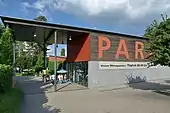 The construction works for the park area and of the so-called Strohhaus building started in 1933 as the private estate of the Duttweiler Institute. It was used as an economic building and later as a clubhouse, burnt down in 1961 and was rebuilt by the S+M architecture company in the same year.[3] On 8 June 1962 Gottlieb Duttweiler died, and a permanent Dutti exhibition at the popular straw house (German: Strohhaus') was established.[1] Beginning in 1972, the Strohhaus building was also used as cultural centre, for other exhibitions and also as a music hall.[3]