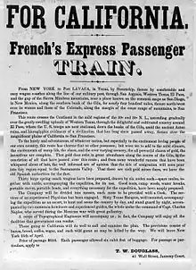 A delay at Havana, including a change of ships and a threatened search consequent of suspicions of French's connection to the López filibuster, resulted in missing their ship connection in New Orleans. This meant a further delay of nearly a week. French put the men up in the best hotels available and all lived well in New Orleans – on French – as the month of May ended.[1] On June 4, French and the additional recruits arrived at Port Lavaca. Those stranded there for nearly a month greeted him with a mixture of relief and fury. When the new arrivals discovered the absence of mules, they, too, became much concerned. French, often described as remarkably persuasive, convinced the crowd that all would be well.[23] He purchased young and unbroken mules somewhere, and, after much more delay, they finally made it to San Antonio via Victoria on July 6. There, as he had in Victoria, French produced such papers as military orders, bank drafts, and an unlimited line of credit drawn on Howland and Aspinwell, a major New York shipping firm.[24] All of it was bogus. He refurbished, re-supplied, bought horses, cattle, and many, better, mules. New recruits signed up. The train of 33 colorful, individually named wagons left San Antonio with much fanfare in mid-July. The sixty days promised for the entire trip had expired and San Diego was still 1,500 miles away.