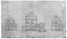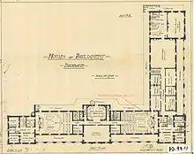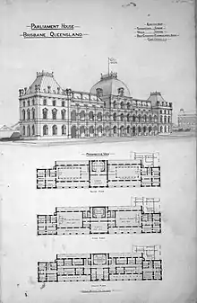 The Parliament of Queensland first met on 22 May 1860 in the former convict barracks on Queen Street.[2] The building was not considered a suitable meeting place for Parliament in the long-term, but the government was preoccupied with the construction of Government House, and plans for a new legislative facility were not made until after its completion.[3] In November 1863 a commission chose the site for the new parliamentary building on the corner of Alice and George Street.[3] The commission soon opened an Australia-wide competition for the new building's design, and offered a 200 guinea prize for the winning submission.[3] In April 1864, a design by Benjamin Backhouse was selected, but was later rejected after it was estimated that it would require £38,000 to construct, exceeding the maximum cost of £20,000 specified in the competition.[3][4] In October 1864, a design by William Henry Ellerker was recommended by the Parliamentary Commissioners.[5] However in November 1865, the commissioners withdrew their recommendation and resigned, following criticism by James Cowlishaw who claimed none of the submissions was satisfactory.[6][7] In December 1864, Ellerker wrote a public complaint about the process,[8] but ultimately plans by Charles Tiffin, the Queensland Colonial Architect, were selected. Amid controversy and allegations of undue influence on the outcome of the competition, Tiffin donated his prize money for the design to the Ipswich Grammar School.
