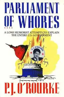 Parliament of Whores: A Lone Humorist Attempts to Explain the Entire U.S. Government is an international best-selling political humor book by P. J. O'Rourke published by Atlantic Monthly Press in 1991. It is a scathing critique of the American system of governance from a libertarian perspective. The hard cover version was a #1 New York Times bestseller, sold over 150,000 copies in its first two months of release, and earned over $1 million in revenue in the same time period.[1] Parliament reached the top 5 on Canadian best seller lists.[2] The paperback release in 1992 was a similar commercial success.