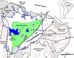 It was regarded as one of the continental fragments inherited by the South American platform after the dispersal of the Rodinia supercontinent to form the Gondwana supercontinent.[8] The São Francisco Craton and São Luis Craton existed before the opening of the Atlantic Ocean in Mesozoic times, were part of larger cratonic landmasses, and probably surrounded a central Parnaíba block presently concealed under the basin's sediments.[9] To the west, the Araguaia suture zone represents the final Neoproterozoic collision between the Amazonian craton and the Parnaíba block and, to the east, the Transbrasiliano Lineament marks the border with the Borborema Province.[8][10]
