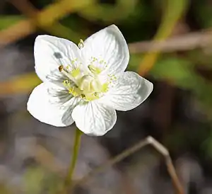 The single flower has five small sepals behind five veined white petals each 1 to 2 centimeters long. At the center of the flower are five stamens and five staminodes with fringes of many hairlike, sphere-tipped lobes.