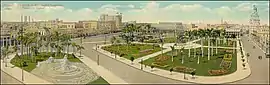 The Parque de la Fraternidad (formerly the Campo de Marte) was built in the 1790s as a military practice range by the Spanish government, It was expanded in 1793 by Belgian engineer Agustin Cramer, and later Bishop Espada improved the lighting of the Campo. It was Captain General Don Miguel Tacón who included it within the scope of his embellishment program. The area was then fenced and four majestic gates, crowned with coats of arms, each representing an important personality: the north gate, Hernán Cortés; the south one, Francisco Pizarro; and the east and west gates, Captain General (Spanish: Capitanía General de Cuba) Miguel Tacón y Rosique (1834-1838),[lower-alpha 1] and Christopher Columbus respectively.