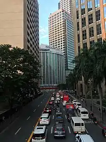 Paseo de Roxas is a prime commercial artery in the Makati Central Business District of Metro Manila, Philippines. It is a two- to six-lane avenue that cuts through the middle of the business district connecting San Lorenzo Village in the west to Bel-Air Village in the east.
