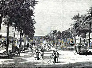 Alameda de Isabel II in Paseo del Prado, Havana, as is depicted in La Ilustración Española y Americana in 1874.[1]