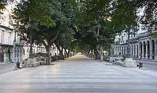 Paseo del Prado is a street and promenade in Havana, Cuba, near the location of the old city wall, and the division between Centro Habana and Old Havana. Technically, the Paseo del Prado includes the entire length of Paseo Martí approximately from the Malecon to Calle Máximo Gómez,[lower-alpha 1] the Fuente de la India fountain. The promenade has had several names; it was renamed Paseo de Martí in 1898 with the island's independence from Spain. Despite the historic references, the people of Havana simply call it "El Prado".