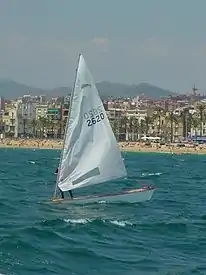Patín a vela, also known as Patín catalán or Catalan catamaran , is a class of boat "one-design" of dinghy sailing with a single crew member. Characterized by being a catamaran with a single sail of type marconi without boom and the peculiarity of not having rudder nor centreboard. The steering of the boat is carried out with the movement and distribution of the weight of the skipper along the length and width of the deck of the ship and with the sheet, which holds the sail. It is specially designed to be used on the beach, this is the reason for not having centreboard or rudder.[1][2][3]