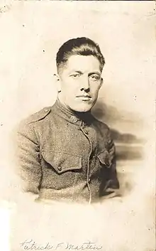 Patrick was inducted into the Army on September 20, 1917, at age 23 in Brooklyn, and served in World War I as a Corporal. He fought in the Battle of Château-Thierry (1918) France from April 6, 1918, to March 11, 1919, with the 306th Infantry Company C. While there, he received a machine gun wound to his leg October 1, 1918. The crucifix in his pocket helped to deflect the bullet, and he was awarded the Purple Heart. Patrick received an honorary discharge on March 28, 1919, and was also given a Victory medal and 2 Battle Clasps. Patrick was reported to be single, 5'11” tall, with blue eyes and brown hair.