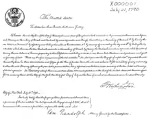 The Patent Act of 1790 (1 Stat. 109) was the first patent statute passed by the federal government of the United States. It was enacted on April 10, 1790, about one year after the constitution was ratified and a new government was organized. The law was concise, defining the subject matter of a U.S. patent as "any useful art, manufacture, engine, machine, or device, or any improvement there on not before known or used."[1] It granted the applicant the "sole and exclusive right and liberty of making, constructing, using and vending to others to be used" of his invention.[2]