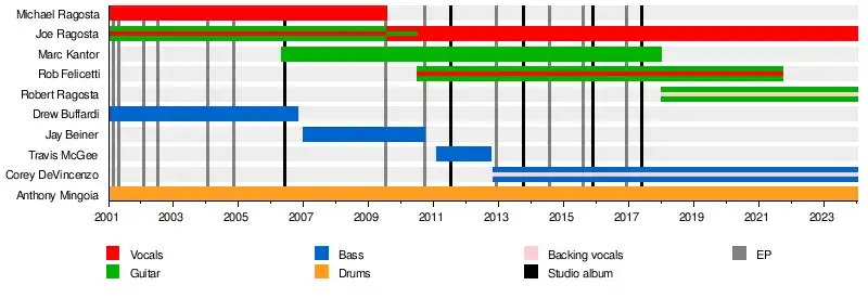 - Joe Ragosta – vocals (2001–2009), lead vocals (2009-present), guitar (2001–2010)