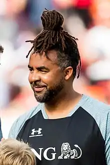 In addition to his football skills, Owomoyela is also a basketball player, having played in the German regional league before switching to football full-time.[6] He was born to a German mother and a Nigerian father.[7][8] His name "Olukayode" stems from the Yoruba words "Olu", a diminutive form of "Oluwa" or Olorun meaning "God" and "Kayode" meaning "to bring joy",[9] which translates to "God brings me joy and happiness".[10]