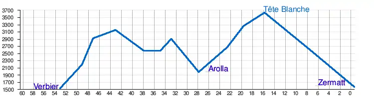 - Zermatt – Arolla – Verbier: 53 kilometres, altitude difference +3994m and – 4090m. This is equivalent to 110 km without altitude difference.