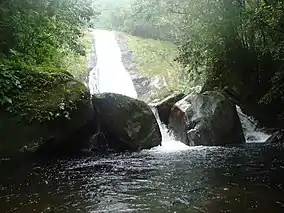 The Pau Oco State Park has an area of 905.58 hectares (2,237.7 acres) in the municipality of Morretes, Paraná.[1] It is part of the Lagamar Mosaic.[2] The park contains the Salto da Fortuna, a waterfall that may be reached by a trail taking about four hours round trip.[3] The fall is 50 metres (160 ft) high and has a large natural pool at its base where visitors may bathe.[4] A local guide is required. The trail is of medium difficulty, crosses rivers, and includes sections and ruins of the old Arraial Colonial Route, now replaced by BR-277.[3] The Arraial Colonial Way was opened between 1586 and 1590. There is an old chapel used by the miners of that time to request protection on their expeditions into the Serra do Mar.[4]