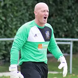 He started his career in the youth team at Coventry City in the eighties and was a member of their 1987 FA Youth Cup winning side that beat a Southampton youth side including Alan Shearer and Matt Le Tissier.[17] He was released by Coventry and signed his first professional contract in 1988 with Cambridge United where he stayed for one season during which he also played once on loan for Bath City in October 1988, a 1–1 draw against VS Rugby.[3] He then moved to Malaysia to play in the Malaysian Super League where he spent six months with Sabah FA.[18] He then moved back to England, where he spent time on trial with Newcastle United[19][20][21] and Leyton Orient,[19] and played a single match for Cheltenham Town in the Gloucestershire Senior Cup in return for a pair of gloves,[20] before signing for Fisher Athletic.[20][19] After a season with Fisher, he transferred to Kettering Town in 1990 where he spent two years.