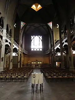 The church structure is based on reinforced cement piers and rib vaults, roofed in two layers of reinforced cement separated by a 4 millimetres (0.16 in) layer of slag.[12] The walls consist of two layers of brick separated by a 7 centimetres (2.8 in) air gap. The church is faced on the outside with orange brick.[13] This was the first religious building to be built from reinforced concrete in France.[14]