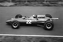 Hawkins participated in three Formula One World Championship Grands Prix, debuting on 1 January 1965 at the South African Grand Prix in a pushrod Ford 1500cc-engined Brabham Formula Two car. Like fellow-Australian Frank Gardner he started with the John Willment Automobiles team. He scored no championship points, as his best finish was ninth on his debut. He did have two podium finishes in the non-championship Rand Grand Prix, held in South Africa. He finished second in 1964 and third in 1965. In 1964 he won the Rhodesian Grand Prix in the Brabham[14] and in 1965 he also won the Cape South Easter Formula One Trophy. He was a non-starter in the 1965 British Grand Prix[15] and retired from the German Grand Prix that year with an oil leak.[16]