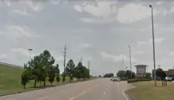 Paul Huff Parkway begins at an intersection with SR 60 (Georgetown Road) in the northwestern part of the city. An extension of the road exists approximately 1⁄8 mile (0.20 km) west of the intersection serving commercial properties. It then immediately crosses Candies Creek Ridge as an undivided four-lane road. At the bottom of the ridge it comes to an intersection with Adkisson Drive/Frontage Road, where a center (turn) lane begins. Adkisson Drive connects to Cleveland State Community College a short distance to the south. About 0.2 miles (0.32 km) later the road comes to an intersection with an interchange with I-75. Afterwards the road enters a large business area, skirting the edge of a few residential neighborhoods, and comes to an intersection with Peerless Road. About 1⁄4 mile (0.40 km) later it reaches Mouse Creek Road, which serves a number of residential neighborhoods to the north. The road then passes between an elementary school and a shopping center on the opposite side, before coming to an intersection with Freedom Parkway. It then passes a fire and ambulance station and crosses South Mouse Creek (commonly referred to as Mouse Creek) and the Cleveland/Bradley County Greenway. Ascending to the top of a minor ridge, the road intersects two unnamed connector roads that provide access to the Bradley Square Mall to the north and Hickory Grove Shopping Center and other commercial establishments to the south. Approximately 1⁄4 mile (0.40 km) later the road comes to an intersection with US 11 (SR 2, Keith Street/North Lee Highway) where it ends and continues east as Stuart Road.[6][7]
