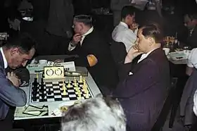 Keres continued to play exceptionally well on the international circuit. He tied 1st–2nd at Hastings 1954–55 with Smyslov on 7/9 (+6−1=2). He dominated an internal Soviet training tournament at Pärnu 1955 with 9½/10. Keres placed 2nd at the 1955 Gothenburg Interzonal, behind David Bronstein, with 13½/20. Keres defeated Wolfgang Unzicker in a 1956 exhibition match at Hamburg by 6–2 (+4−0=4). He tied 2nd–3rd in the USSR Championship, Moscow 1957 (URS-ch24) with 13½/21 (+8−2=11), along with Bronstein, behind Mikhail Tal. Keres won Mar del Plata 1957 (15/17, ahead of Miguel Najdorf), and Santiago 1957 with 6/7, ahead of Alexander Kotov. He won Hastings 1957–58 (7½/9, ahead of Svetozar Gligorić). He was tied 3rd–4th at Zürich 1959, at 10½/15, along with Bobby Fischer, behind Tal and Gligorić. He placed tied 7–8th in the USSR Championship, Tbilisi 1959 (URS-ch26) with 10½/19, as Petrosian won. Keres was third at Stockholm 1959–60 with 7/9. He won at Pärnu 1960 with 12/15. He was the champion at Zürich 1961 (9/11, ahead of Petrosian). At the elite Bled 1961 event, Keres shared 3rd–5th places, on 12½/19 (+7−1=11), behind Mikhail Tal and Bobby Fischer.[22] In the USSR Championship, Baku 1961 (URS-ch29), Keres scored 11/20 for a shared 8–11th place, as Boris Spassky won. Keres shared first with World Champion Tigran Petrosian at the very strong 1963 Piatigorsky Cup in Los Angeles with 8½/14.[8]