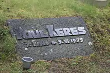 Keres died of a heart attack in Helsinki, Finland, at the age of 59 (it is often erroneusly reported that he died on the same date in Vancouver, Canada). His death occurred while returning to Estonia from a tournament in Vancouver, which he had won.[8] He was buried at Metsakalmistu cemetery in Tallinn. The Paul Keres Memorial Tournaments have been held annually mainly in Vancouver and Tallinn ever since.