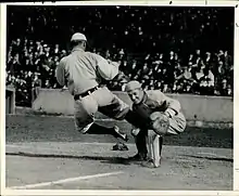 After the 1912 season, the Browns released Krichell, but after recovering from his injury, he played six seasons in the minor leagues. He was the starting catcher for the Buffalo Bisons in 1914 when Babe Ruth made his professional debut with the Baltimore Orioles, hitting a double and a single against his pitching.[10] From 1917 to 1918, Krichell served as manager for Bridgeport of the Eastern League, making several playing appearances over the two seasons.[11] He resigned on June 27, 1918, after two wins were forfeited when he used a player not under contract.[12] He worked in the shipyards during the First World War.[10] During the offseason, Krichell became the owner of a saloon popular with players in the Bronx,[13] before Prohibition forced Krichell to close and return to baseball.[13] For the 1919 season, he coached the New York University baseball team,[11] and after the season ended, he signed with Ed Barrow to become a coach and scout for the Boston Red Sox in the following season.[14]